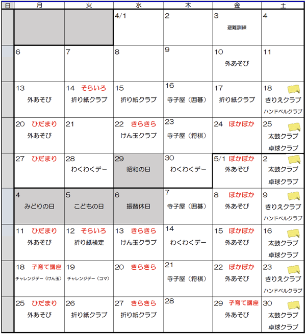 具体的な内容は、おたより(PDF)を確認、又は児童館にお問い合せください。